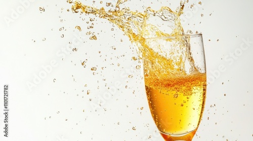Champagne glass with orange juice splashing over the rim, creating dynamic patterns and sparkling highlights, on white