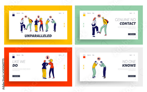 Characters Greeting Each Other With Feet and Elbows Landing Page Template Set. Friends or Colleagues Alternative Non-contact Greet During Coronavirus Epidemic Safety. Linear People Vector Illustration