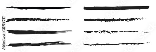 Charcoal pencil straight horizontal lines. Scribble black strokes vector set. Charcoal texture lines isolated on white background. Grunge smears, thin and thick chalk strokes, pencil dividers.