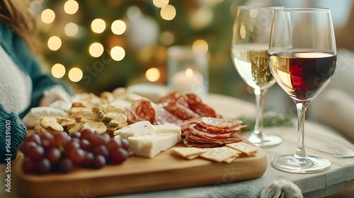 Charcuterie Board with Glasses of Red and White Wine in Cozy Setting