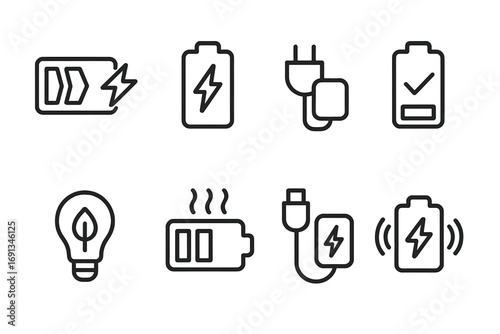 Charging Icons Set. Outline icon set of charging technology: fast charging, trickle charging, battery saver mode, power delivery,
