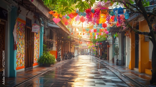 Charming alleyway after rain, vibrant colorful banners hanging overhead, empty cobblestone streets glowing in warm light.