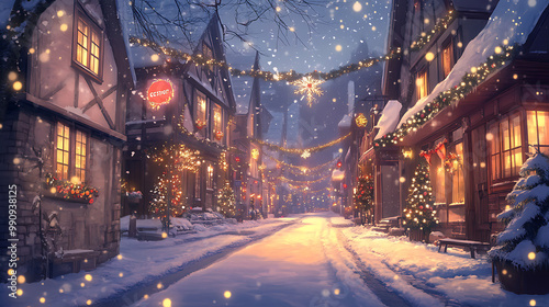 Charming background with a cozy anime winter scene, showcasing snow-covered streets, warm lights, and decorations