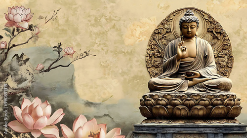 Charming Buddhist background with hand-drawn Buddha figures, lotus flowers, and subtle textures