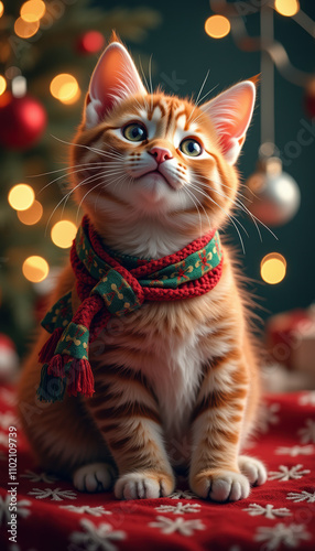 Charming cat in a cozy setting adorned with Christmas decorations, perfect for holiday cards.