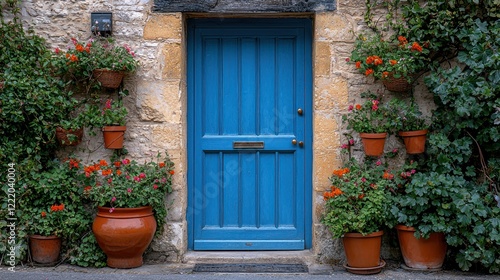Charming Cottage Entrance with Vibrant Flower Pots and a Blue Door
