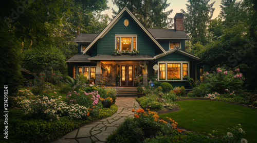 Charming craftsman style home exterior with dark green siding, surrounded by lush gardens and colorful flowers, creating warm and inviting atmosphere