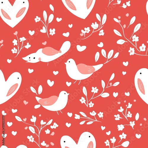 Charming Hand-Drawn Seamless Pattern Featuring Whimsical Birds and Hearts Perfect for Celebrations, Crafts, and Festive Decor in a Delightful Red Background