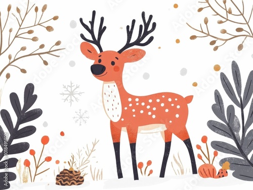 Charming illustrated reindeer in a festive Christmas card design Flat minimalist style with decorative elements like antlers pine branches and snowflakes on a clean white background
