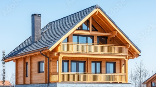 Charming log cabin home under a slate roof. Spacious, two-story structure with wooden beams. Balconies and large windows