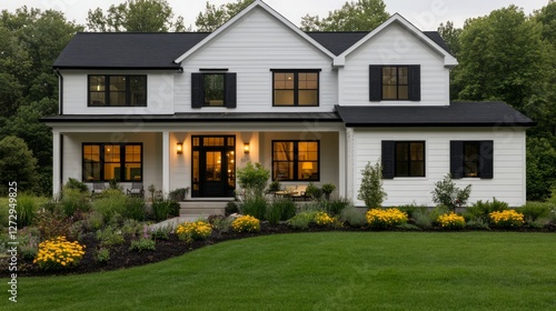 Charming Modern White House Surrounded by Lush Greenery and Vibrant Flowerbeds, Showcasing a Welcoming Front Porch in the Evening Light