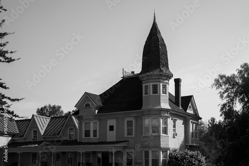 Charming New England landmark architecture lines Main Street in Stratton and Eustis, Maine, USA, a retro style black and white photo