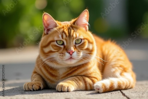 Charming orange tabby cat lounging in the sun with bright green eyes and distinctive stripes on a sunny day in a garden setting