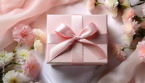 Charming pastel gift box adorned with a pink ribbon, surrounded by delicate flowers and fabric. Generated image