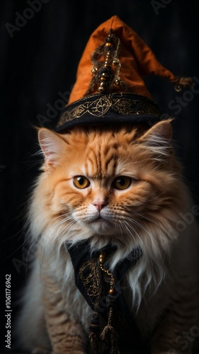 Charming Persian Cat in an Intricate Black Wizard Hat Capturing the Essence of Magical Wonder