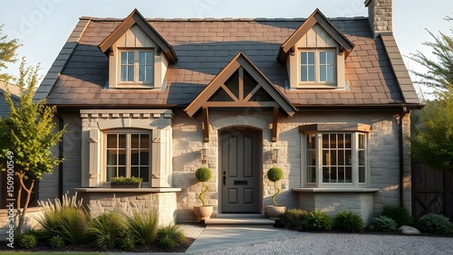 Charming residential house with elegant architectural details and a welcoming garden, radiating coziness and tranquility