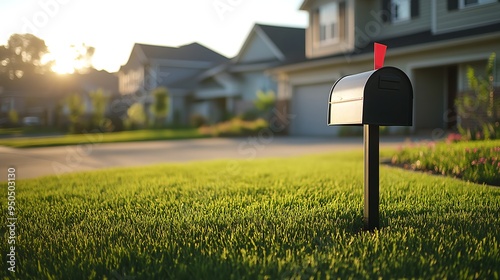 Charming suburban home at golden hour with warm sunlight on a neatly trimmed lawn, traditional mailbox with raised red flag