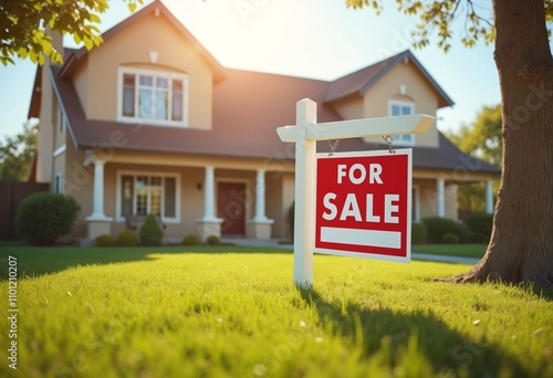 Charming suburban house for sale with front yard and FOR SALE sign on sunny day