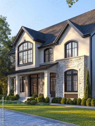 Charming two-story suburban house with a modern design, featuring stone accents, large windows, and a well-maintained front yard.
