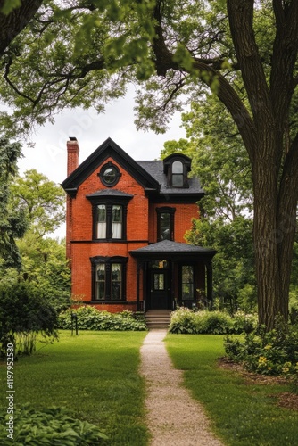 Charming Victorian house with vibrant red brick exterior surrounded by lush greenery in a serene neighborhood during a sunny day