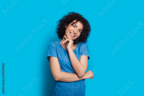 Charming woman with curly black hair is touching her chin and posing on a blue background in a dress