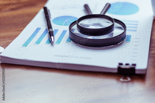 Charts and graphs are placed on the desks, data, and statistical performance of the company in the past year.