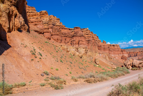 Charyn Canyon, Valley of Castles. The excellence of Kazakhstan. Panorama of natural unusual landscape. The red canyon of extraordinary beauty looks like a Martian landscape.
