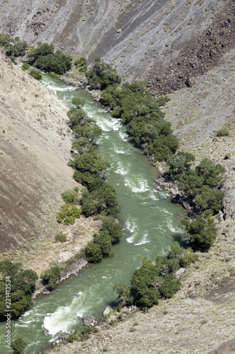 Charyn River flows within the Charyn Canyon and provides a fertile shore with its water. The canyon is also called valley of castles and is located east of Almaty in Kazakhstan.