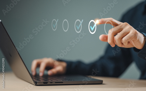 check, document, checklist, choice, guarantee, answer, assurance, certificate, choose, list. A person is using a laptop with a check mark on it. The check mark is on a screen that has a check box.