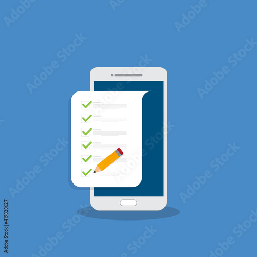 Check list document on smartphone, smartphone with paper check list and to do list with checkboxes, concept of survey, online quiz, completed things or done test, feedback.
