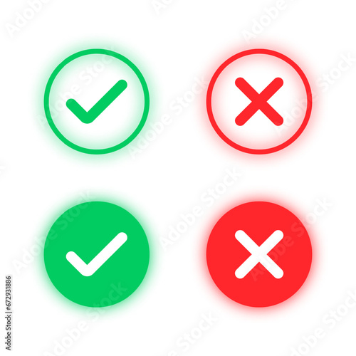 Check mark and cross mark in neon style. Green tick and red cross check marks in glassmorphism style. Vector EPS 10