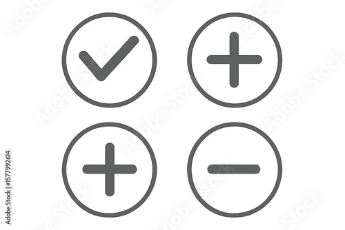 Check mark, plus, and minus icon set. Yes, no, add, and subtract symbols. Correct, incorrect, positive, negative signs. Accept, decline, vote button collection for UI.