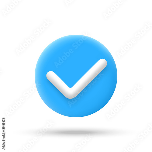 Check mark round blue icon in 3d cartoon minimal style. Vector illustration.