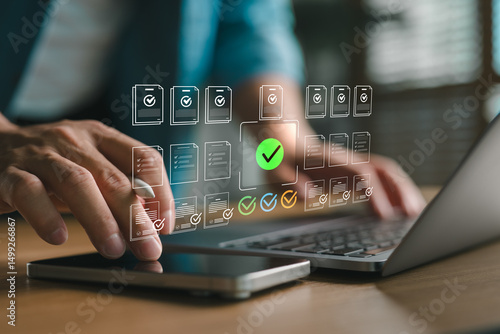 Checklist and document management system concept with digital quality control. Man using tablet and laptop to verify online forms, audits, and workflow approval with futuristic interface icons.