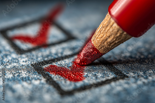 Checklist completion with red pencil on textured surface highlighting organization and productivity