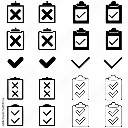 Checklist vector icon set, checkmarks, cross symbols, and clipboard designs vector style. That is perfect for task management, to do lists, forms.