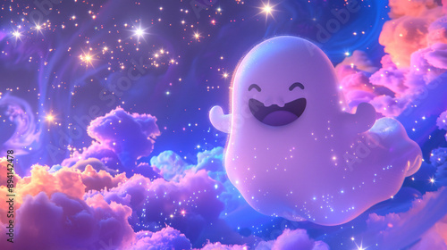 Cheerful 3D cartoon ghost with a wide grin, drifting through a magical night sky filled with sparkling stars and whimsical clouds, detailed in 8K quality