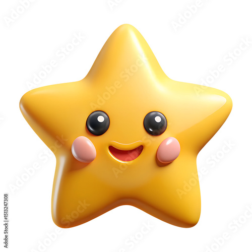 Cheerful 3d rendering of a yellow star character with a cute smile and rosy cheeks on a transparent background.