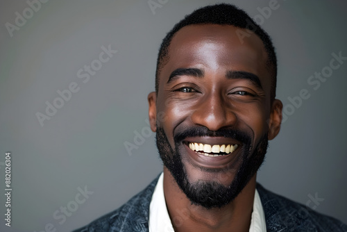 Cheerful African American businessman with healthy teeth smiling at the camera on a studio blank background, perfect for professional and business content.