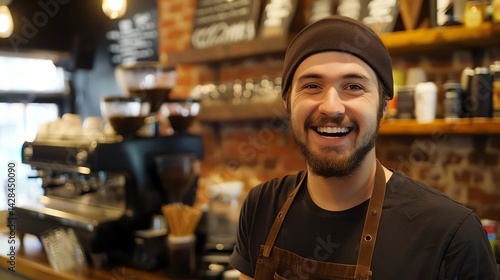 Cheerful barista wearing apron standing in coffee shop and looking at camera. Small business owner.