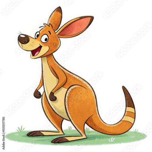 Cheerful Brown Kangaroo Cartoon Standing on Green Grass with a White Background