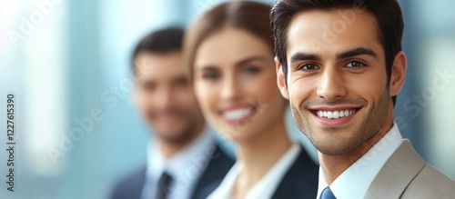 Cheerful business team collaborating in modern office with focus on smiling professionals and empty space for text overlay