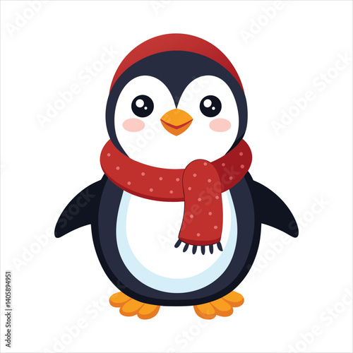 Cheerful Cartoon Penguin with Winter Scarf and Hat in Snowy Setting