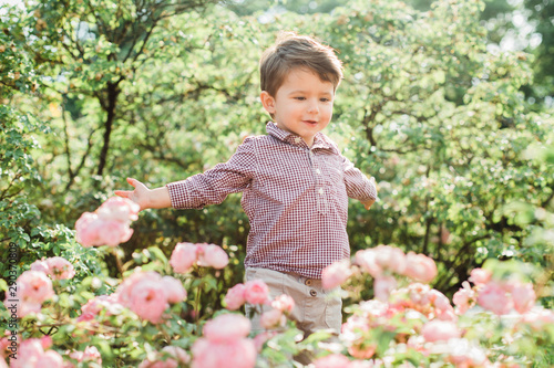 Cheerful cute little boy having fun in park. Happy childhood.