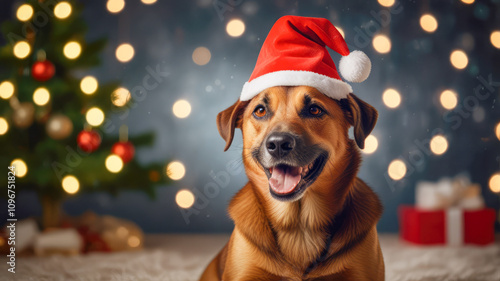 cheerful dog in a Christmas cap against the background of New Year's lights
