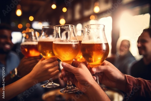 Cheerful Friends Toasting with Frothy Beer Glasses in a Cozy Bar