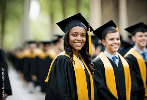Cheerful graduate in black and yellow gown with cap posing in front of other graduates