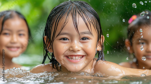 Cheerful group of children playing in water outdoors, with focus on smiling child enjoying moment. scene is vibrant, with splashes of water and lush greenery in background