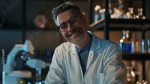 Cheerful male scientist working in a lab, wearing glasses and a lab coat, surrounded by laboratory equipment.