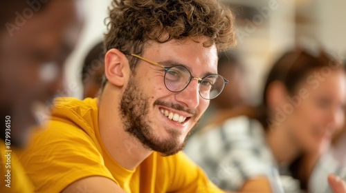 Cheerful man with glasses and curly hair smiling amidst friends in a close-knit group, symbolizing positive interactions, friendship, and shared joy in a social setting.